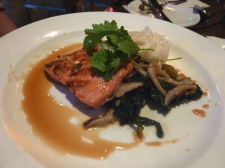 My friend and I both decide to have Wild Alaskan Sockeye Salmon which is served with jasmine rice, gingered swiss chard, and yuzu-sake glaze. The Asian flavors are sweet with just a hint of spice. It is a fairly simple dish but it is well prepared, although my friend finds her swiss chard a little chewy and is dismayed at her portion of mushrooms. I have to admit that there are a few more mushrooms on my plate compared to hers.