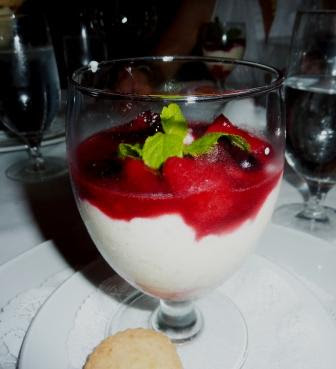 I am a model of restraint when it comes to dessert. I have rhubarb sorbetti. The flavor is indistinguishable as rhubarb but the texture is good, as is the accompanying fresh fruit. My companions have “modernized tiramisu” which in this case is deconstructed and served in a martini glass, and rice pudding with berries. I am told that they are both good. I don’t taste either one. I should have for the sake of the blog post but I am trying to atone for the caloric intake of my first two courses. |